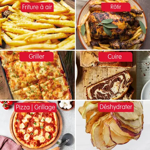10 modes de cuisson : Friture à air, Rôtir, Grill, Cuisson, Pizza, Toast, Déshydrater, Bagel, Chauffer, Réchauffer