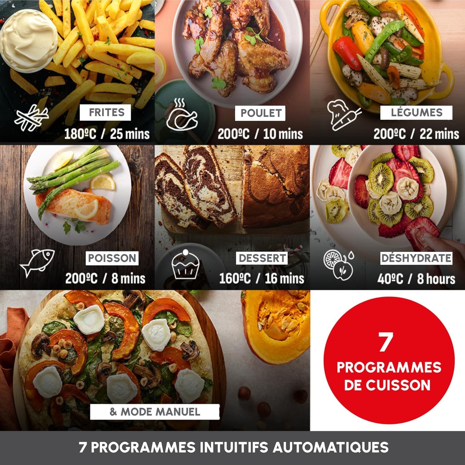 Polyvalence maximale : 7 programmes automatiques (frites, poulet, légumes, poisson, desserts, déshydratation, manuel) avec température réglable de 40 à 200°C.