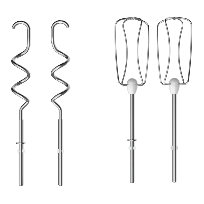 Fouets et crochets robustes – Les fouets en acier inoxydable réussissent à merveille les blancs d’œufs, la crème fouettée et les pâtes légères, tandis que les crochets pétrisseurs s’attaquent sans effort aux pâtes épaisses et consistantes.